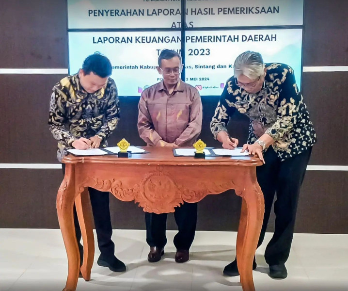 Sintang-www.sintang-terkini.com-Bupati Sintang, dr. H. Jarot Winarno, M.Med.PH., menerima penyerahan laporan hasil pemeriksaan atas Laporan Keuangan Pemerintah Daerah (LKPD) tahun anggaran 2023 dari Badan Pemeriksa Keuangan Republik Indonesia perwakilan Provinsi Kalimantan Barat, bertempat di Kantor Badan Pemeriksa Keuangan Perwakilan Provinsi Kalimantan Barat, Kota Pontianak, Jumat, 3 Mei 2024.